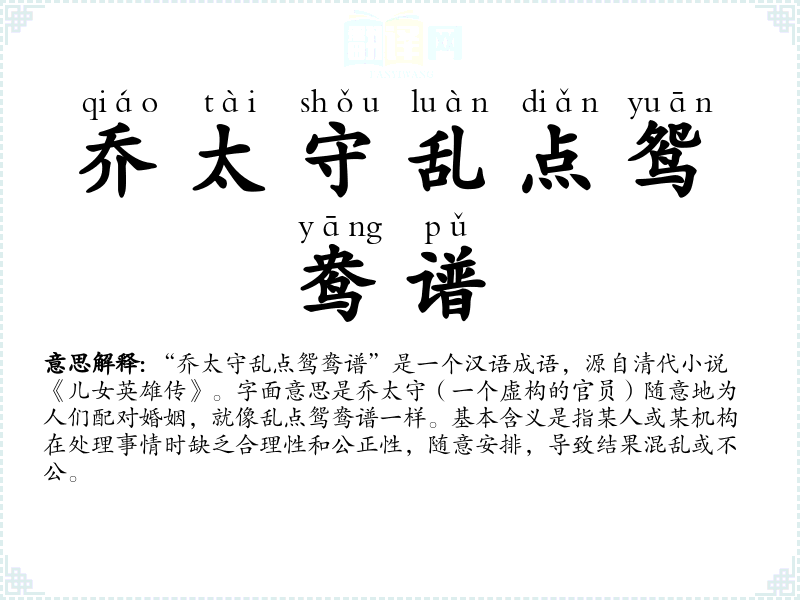 “乔太守乱点鸳鸯谱”是一个汉语成语,源自清代小说《儿女英雄传》。字面意思是乔太守(一个虚构的官员)随意地为人们配对婚姻,就像乱点鸳鸯谱一样。基本含义是指某人或某机构在处理事情时缺乏合理性和公正性,随意安排,导致结果混乱或不公。