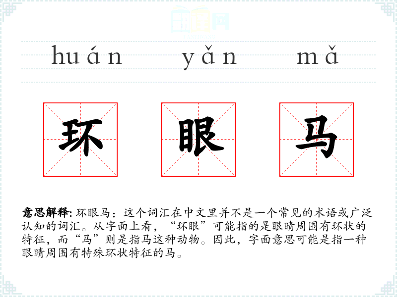 由于“环眼马”不是一个标准词汇,很难找到确切的同义词或反义词。如果将其视为一种描述性的词汇,可能的同义词包括“眼环马”或“环状眼马”,但这些都不是标准词汇。反义词则更难定义,因为没有明确的对比对象。