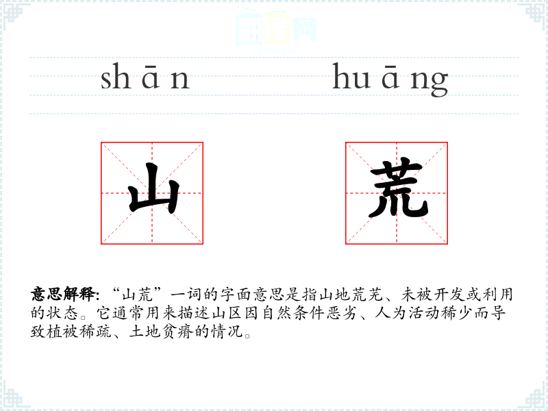 “山荒”一词的字面意思是指山地荒芜、未被开发或利用的状态。它通常用来描述山区因自然条件恶劣、人为活动稀少而导致植被稀疏、土地贫瘠的情况。