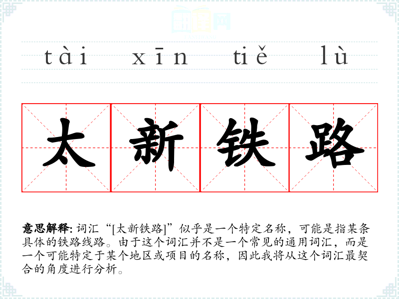 词汇“[太新铁路]”似乎是一个特定名称,可能是指某条具体的铁路线路。由于这个词汇并不是一个常见的通用词汇,而是一个可能特定于某个地区或项目的名称,因此我将从这个词汇最契合的角度进行分析。
