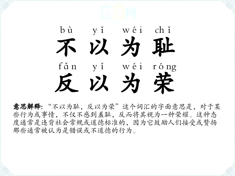 “不以为耻,反以为荣”这个词汇的字面意思是,对于某些行为或事情,不仅不感到羞耻,反而将其视为一种荣耀。这种态度通常是违背社会常规或道德标准的,因为它鼓励人们接受或赞扬那些通常被认为是错误或不道德的行为。