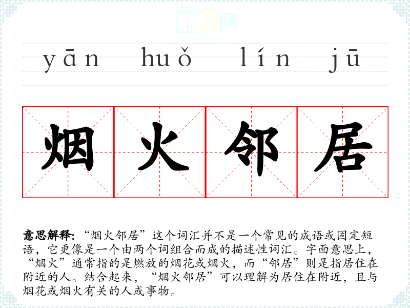 “烟火邻居”这个词汇并不是一个常见的成语或固定短语,它更像是一个由两个词组合而成的描述性词汇。字面意思上,“烟火”通常指的是燃放的烟花或烟火,而“邻居”则是指居住在附近的人。结合起来,“烟火邻居”可以理解为居住在附近,且与烟花或烟火有关的人或事物。