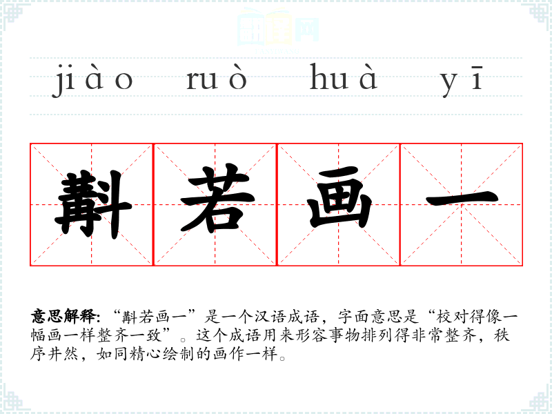 “斠若画一”是一个汉语成语,字面意思是“校对得像一幅画一样整齐一致”。这个成语用来形容事物排列得非常整齐,秩序井然,如同精心绘制的画作一样。