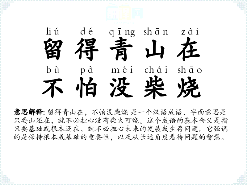 留得青山在,不怕没柴烧 是一个汉语成语,字面意思是只要山还在,就不必担心没有柴火可烧。这个成语的基本含义是指只要基础或根本还在,就不必担心未来的发展或生存问题。它强调的是保持根本或基础的重要性,以及从长远角度看待问题的智慧。