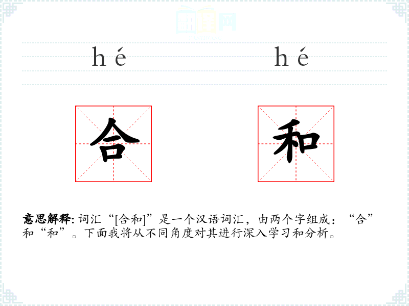 词汇“[合和]”是一个汉语词汇,由两个字组成:“合”和“和”。下面我将从不同角度对其进行深入学*和分析。
