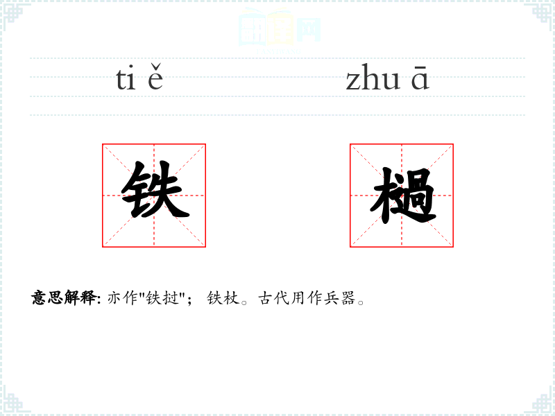 亦作"铁挝"; 铁杖。古代用作兵器。