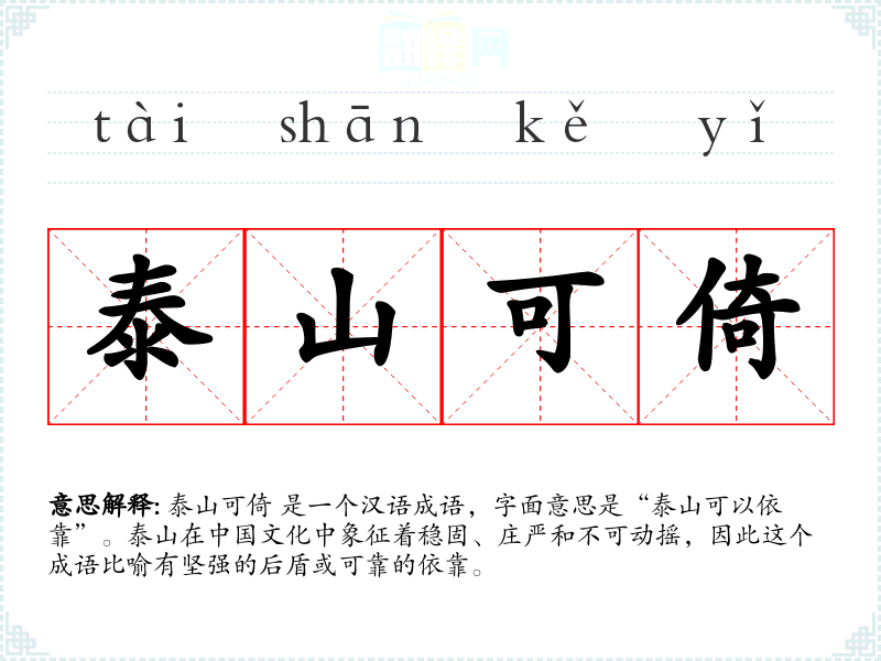 泰山可倚 是一个汉语成语,字面意思是“泰山可以依靠”。泰山在**文化中象征着稳固、庄严和不可动摇,因此这个成语比喻有坚强的后盾或可靠的依靠。