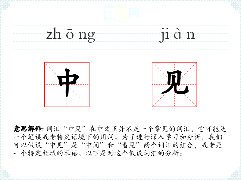 词汇“中见”在中文里并不是一个常见的词汇,它可能是一个笔误或者特定语境下的用词。为了进行深入学*和分析,我们可以假设“中见”是“中间”和“看见”两个词汇的组合,或者是一个特定领域的术语。以下是对这个假设词汇的分析: