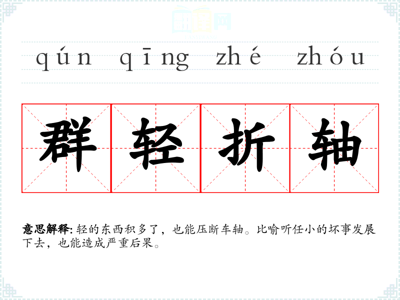 轻的东西积多了,也能压断车轴。比喻听任小的坏事发展下去,也能造成严重后果。