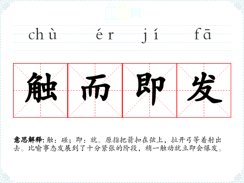 触:碰;即:就。原指把箭扣在弦上,拉开弓等着射出去。比喻事态发展到了十分紧张的阶段,稍一触动就立即会爆发。