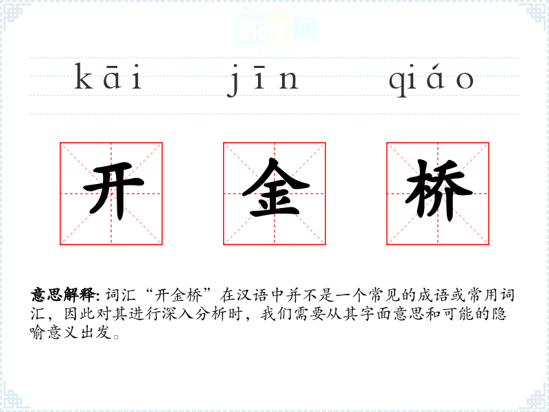 词汇“开金桥”在汉语中并不是一个常见的成语或常用词汇,因此对其进行深入分析时,我们需要从其字面意思和可能的隐喻意义出发。