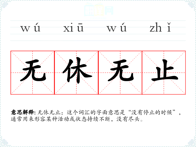 “无休无止”是由“无休”和“无止”两个词组合而成,强调了“没有休息”和“没有终点”的双重含义。在古代汉语中,类似的表达可能更为简洁,但随着语言的发展,这种复合表达方式更加丰富了语言的表达能力。
