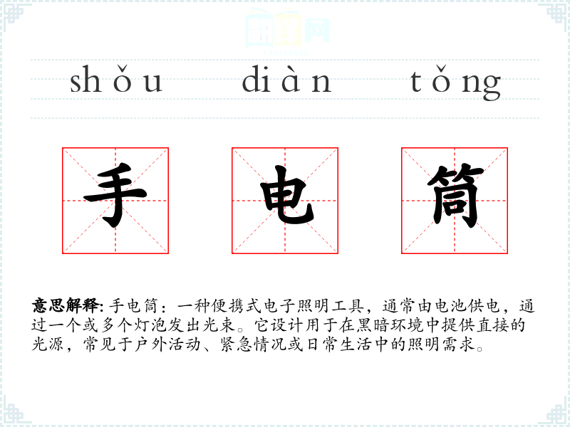 - 反义词:无,因为手电筒是一个特定的物品,没有直接的反义词。