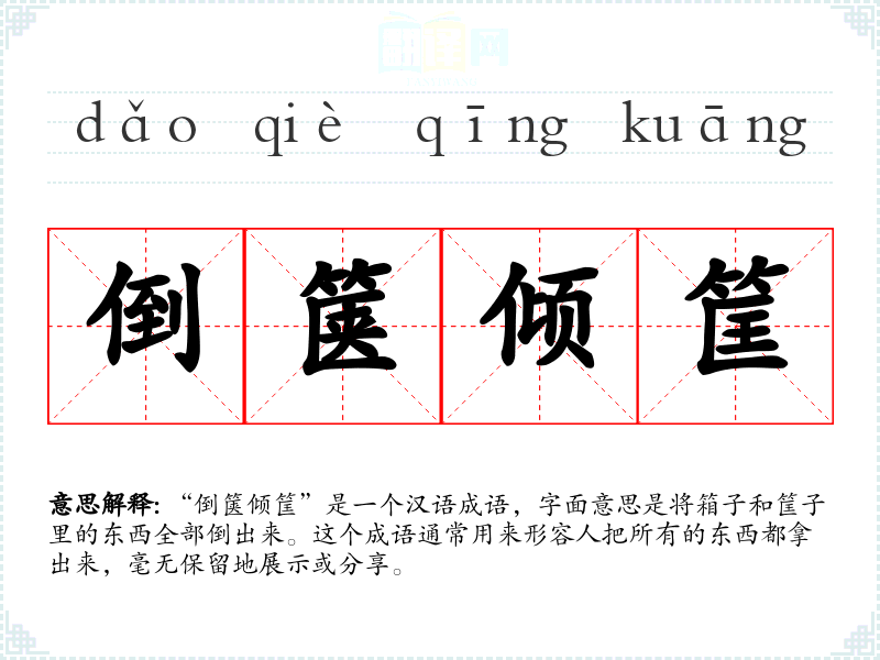 “倒箧倾筐”是一个汉语成语,字面意思是将箱子和筐子里的东西全部倒出来。这个成语通常用来形容人把所有的东西都拿出来,毫无保留地展示或分享。