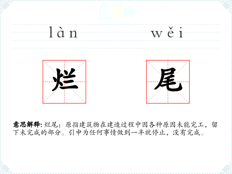 烂尾:原指建筑物在建造过程中因各种原因未能完工,留下未完成的部分。引申为任何事情做到一半就停止,没有完成。
