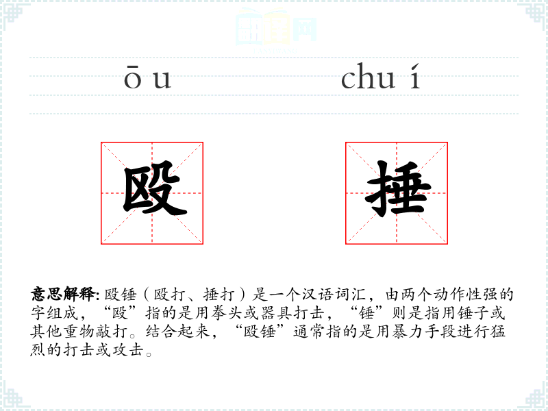 “殴”字源自古代汉语,最初指的是用手打击,后来泛指各种打击行为。“锤”字则源自锤子的形状和功能,用于敲打硬物。两个字结合,强调了动作的暴力和力度。