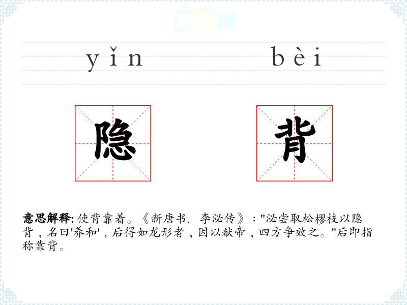 使背靠着。《新唐书.李泌传》﹕"泌尝取松樛枝以隐背﹐名曰'养和'﹐后得如龙形者﹐因以献帝﹐四方争效之。"后即指称靠背。