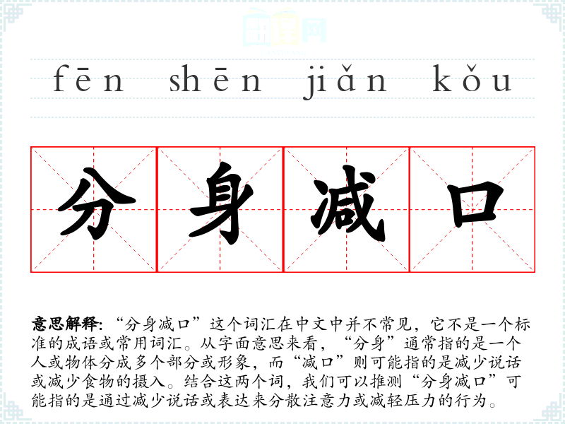 由于“分身减口”不是一个标准词汇,它的词源和演变并不明确。可能是由“分身”和“减口”这两个词组合而成,用于描述特定的行为或状态。