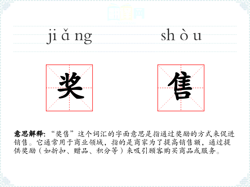 “奖售”这个词汇的字面意思是指通过奖励的方式来促进销售。它通常用于商业领域,指的是商家为了提高销售额,通过提供奖励(如折扣、赠品、积分等)来吸引顾客购买商品或服务。