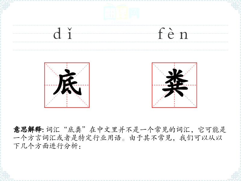 词汇“底粪”在中文里并不是一个常见的词汇,它可能是一个方言词汇或者是特定行业用语。由于其不常见,我们可以从以下几个方面进行分析:
