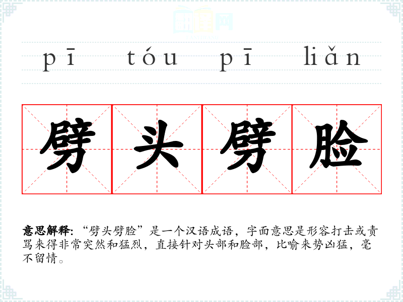 “劈头劈脸”是一个汉语成语,字面意思是形容打击或责骂来得非常突然和猛烈,直接针对头部和脸部,比喻来势凶猛,毫不留情。
