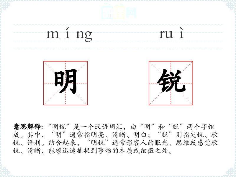 “明锐”作为一个复合词,其构成部分“明”和“锐”在古代汉语中已有使用。随着语言的发展,这两个词逐渐结合,形成了形容感知和思维能力的词汇。在现代汉语中,“明锐”的使用更加广泛,不仅限于形容人的能力,也可以用来形容工具或设备的性能。