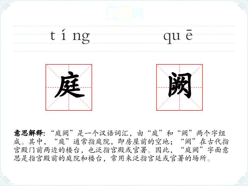 “庭阙”一词源自古代汉语,其中“庭”字最早见于甲骨文,意为庭院;“阙”字则源于古代宫殿建筑的特征,指宫门两边的楼台。随着历史的发展,“庭阙”逐渐成为泛指宫廷或官署的词汇。