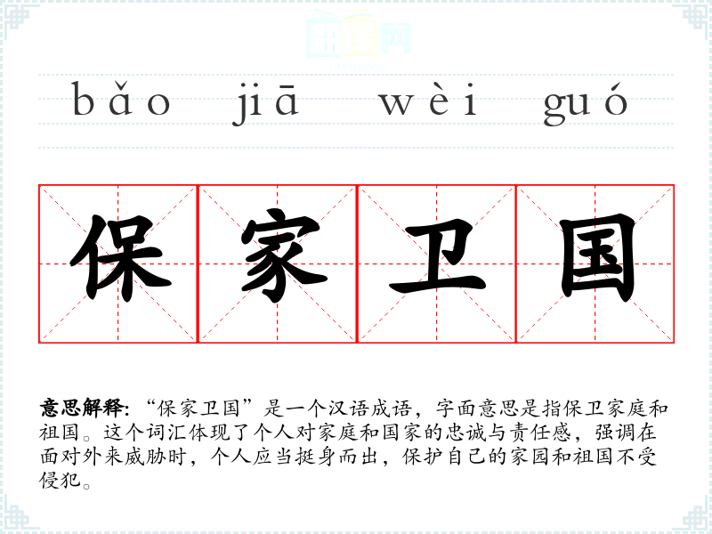 “保家卫国”是一个汉语成语,字面意思是指保卫家庭和祖国。这个词汇体现了个人对家庭和国家的忠诚与责任感,强调在面对外来威胁时,个人应当挺身而出,保护自己的家园和祖国不受侵犯。