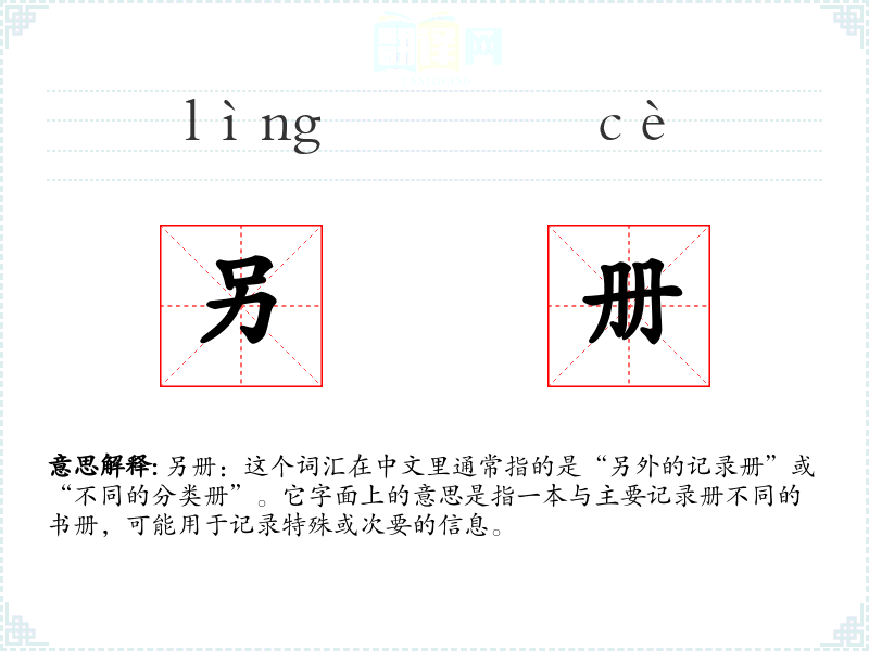 另册:这个词汇在中文里通常指的是“另外的记录册”或“不同的分类册”。它字面上的意思是指一本与主要记录册不同的书册,可能用于记录特殊或次要的信息。