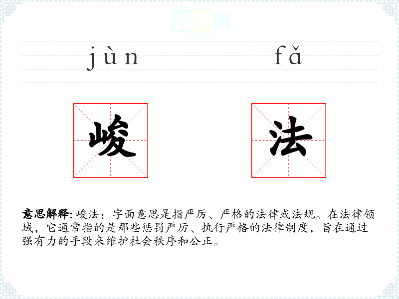 峻法一词在法律领域具有重要的意义,它不仅体现了法律的威严和不可侵犯性,也反映了社会对秩序和公正的追求。在学*语言和表达中,理解和正确使用峻法一词,有助于更好地传达法律的严肃性和重要性。