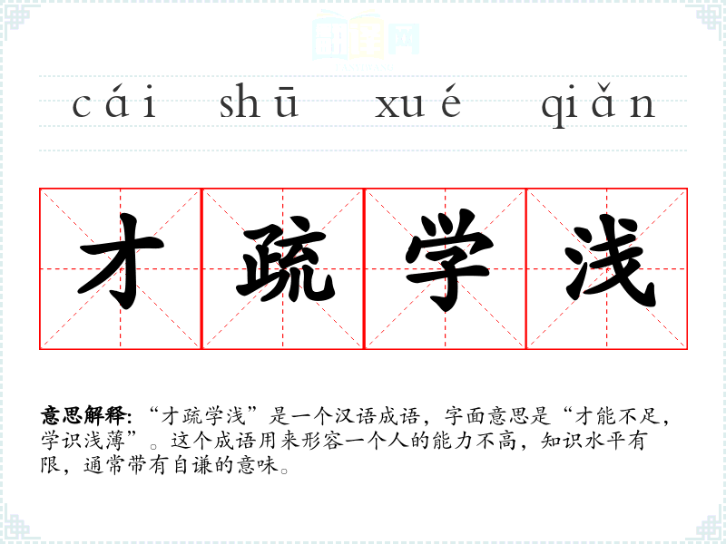 “才疏学浅”是一个汉语成语,字面意思是“才能不足,学识浅*”。这个成语用来形容一个人的能力不高,知识水平有限,通常带有自谦的意味。