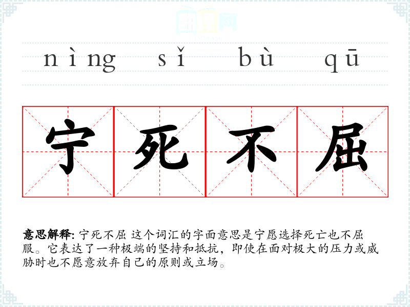 宁死不屈 这个词汇的字面意思是宁愿选择死亡也不屈服。它表达了一种极端的坚持和抵抗,即使在面对极大的压力或威胁时也不愿意放弃自己的原则或立场。