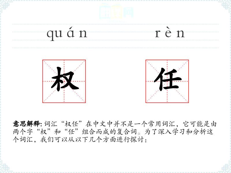 词汇“权任”在中文中并不是一个常用词汇,它可能是由两个字“权”和“任”组合而成的复合词。为了深入学*和分析这个词汇,我们可以从以下几个方面进行探讨: