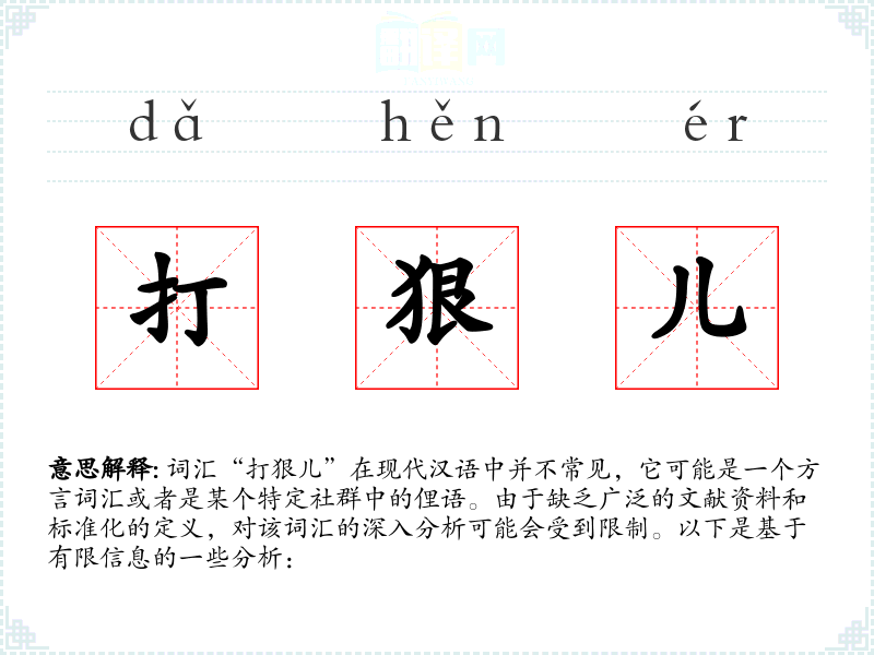 词汇“打狠儿”在现代汉语中并不常见,它可能是一个方言词汇或者是某个特定社群中的俚语。由于缺乏广泛的文献资料和标准化的定义,对该词汇的深入分析可能会受到限制。以下是基于有限信息的一些分析: