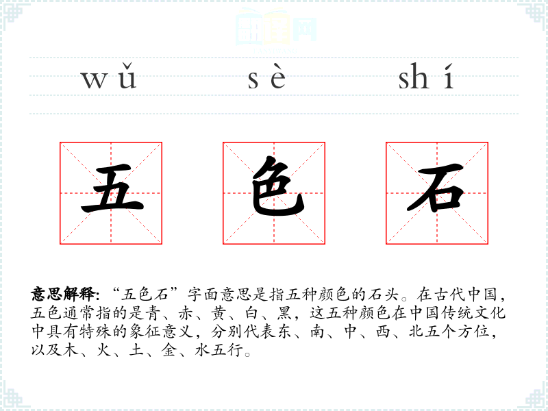 “五色石”字面意思是指五种颜色的石头。在古代,五色通常指的是青、赤、黄、白、黑,这五种颜色在传统文化中具有特殊的象征意义,分别代表东、南、中、西、北五个方位,以及木、火、土、金、水五行。