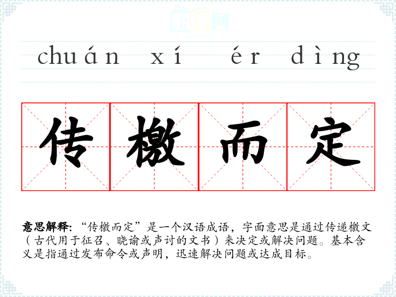 在文学作品中,“传檄而定”常用来形容领导者或权威人士通过发布命令或声明,迅速稳定局势或解决问题。在口语中,这个成语可能不太常用,但在专业领域,如政治、军事或管理学中,它可能被用来描述高效的决策过程。