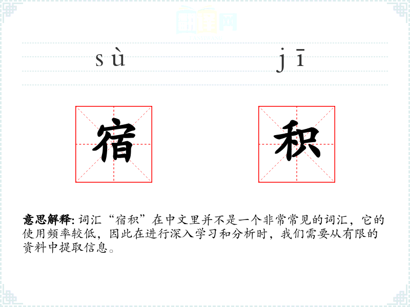 词汇“宿积”在中文里并不是一个非常常见的词汇,它的使用频率较低,因此在进行深入学习和分析时,我们需要从有限的资料中提取信息。