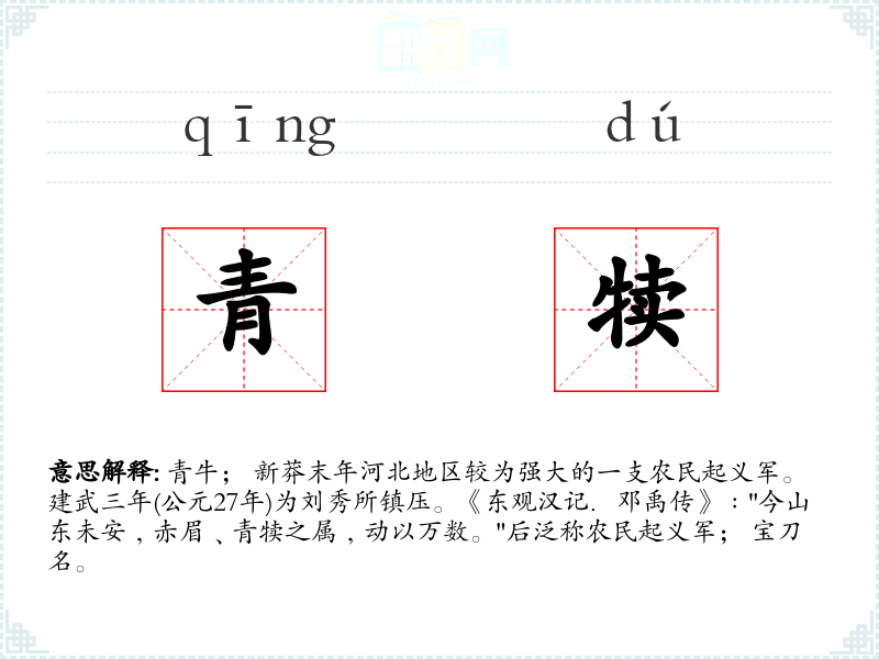 青牛; 新莽末年河北地区较为强大的一支农民起义军。建武三年(公元27年)为刘秀所镇压。《东观汉记.邓禹传》﹕"今山东未安﹐赤眉﹑青犊之属﹐动以万数。"后泛称农民起义军; 宝刀名。
