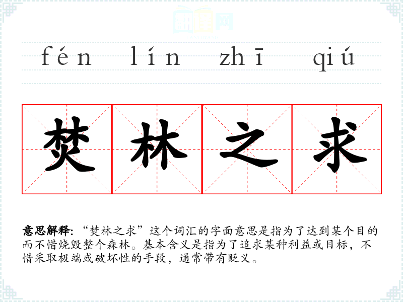 “焚林之求”这个词汇的字面意思是指为了达到某个目的而不惜烧毁整个森林。基本含义是指为了追求某种利益或目标,不惜采取极端或破坏性的手段,通常带有贬义。