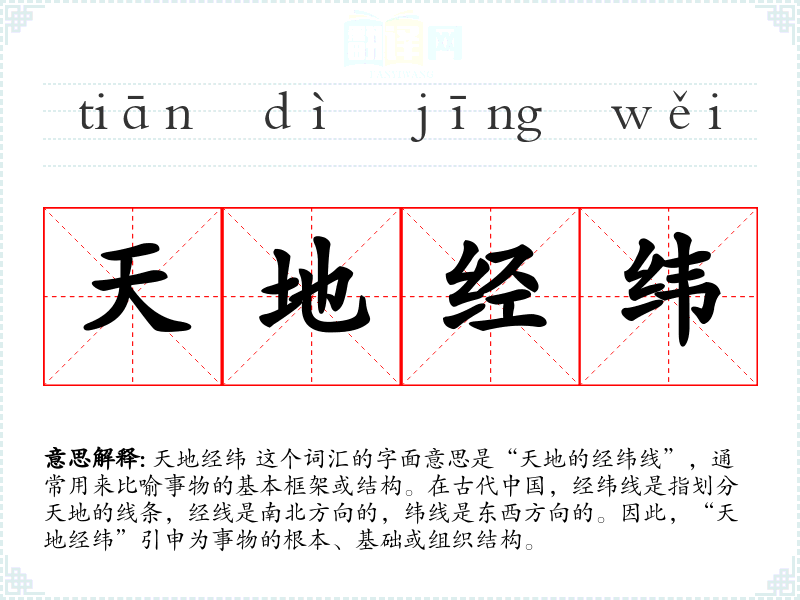 天地经纬 这个词汇的字面意思是“天地的经纬线”,通常用来比喻事物的基本框架或结构。在古代**,经纬线是指划分天地的线条,经线是南北方向的,纬线是东西方向的。因此,“天地经纬”引申为事物的根本、基础或组织结构。