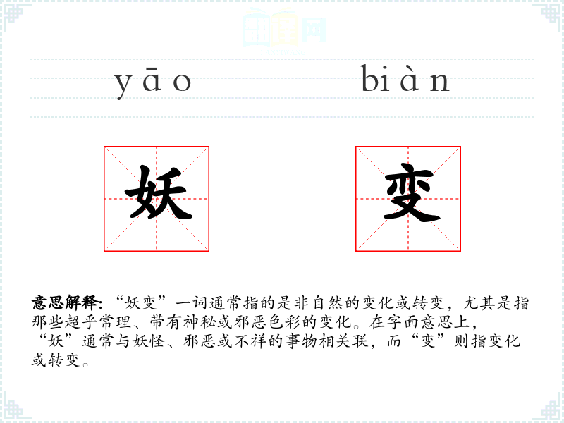 “妖变”一词通常指的是非自然的变化或转变,尤其是指那些超乎常理、带有神秘或邪恶色彩的变化。在字面意思上,“妖”通常与妖怪、邪恶或不祥的事物相关联,而“变”则指变化或转变。