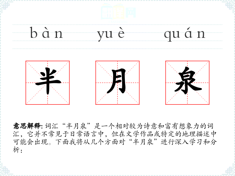 词汇“半月泉”是一个相对较为诗意和富有想象力的词汇,它并不常见于日常语言中,但在文学作品或特定的地理描述中可能会出现。下面我将从几个方面对“半月泉”进行深入学*和分析: