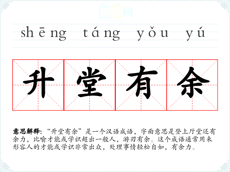 “升堂有余”是一个汉语成语,字面意思是登上厅堂还有余力,比喻才能或学识超出一般人,游刃有余。这个成语通常用来形容人的才能或学识非常出众,处理事情轻松自如,有余力。