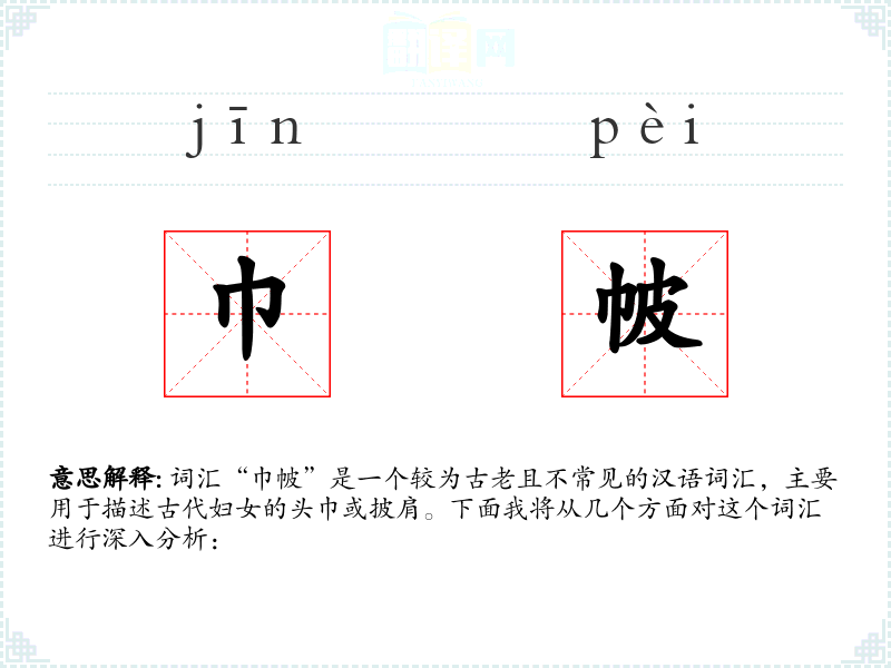 词汇“巾帔”是一个较为古老且不常见的汉语词汇,主要用于描述古代妇女的头巾或披肩。下面我将从几个方面对这个词汇进行深入分析: