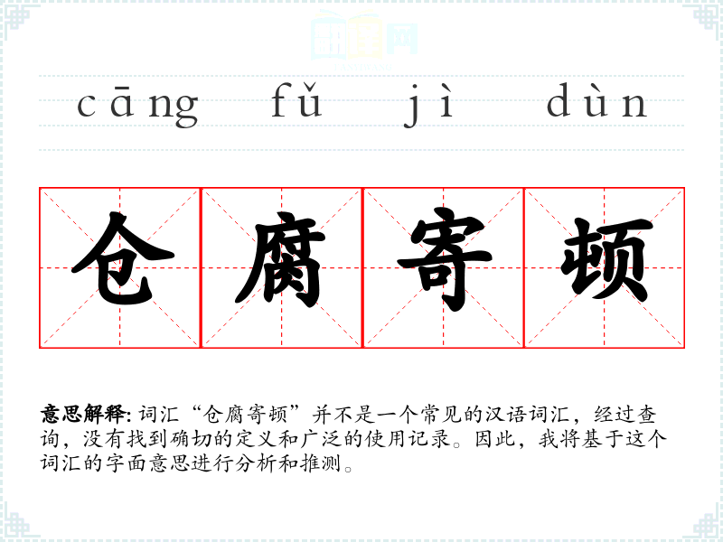 词汇“仓腐寄顿”并不是一个常见的汉语词汇,经过查询,没有找到确切的定义和广泛的使用记录。因此,我将基于这个词汇的字面意思进行分析和推测。