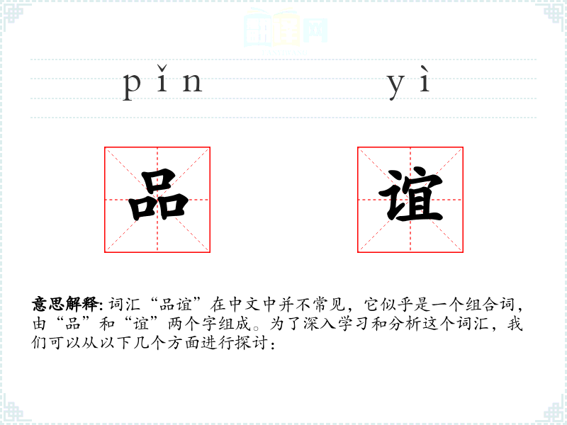 词汇“品谊”在中文中并不常见,它似乎是一个组合词,由“品”和“谊”两个字组成。为了深入学*和分析这个词汇,我们可以从以下几个方面进行探讨: