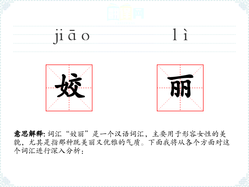 词汇“姣丽”是一个汉语词汇,主要用于形容女性的美貌,尤其是指那种既美丽又优雅的气质。下面我将从各个方面对这个词汇进行深入分析: