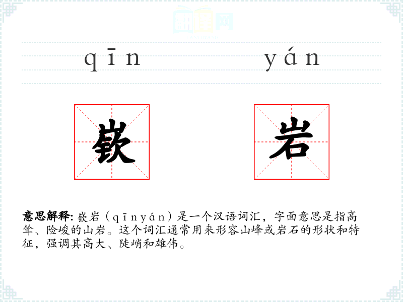 嵚岩(qīn yán)是一个汉语词汇,字面意思是指高耸、险峻的山岩。这个词汇通常用来形容山峰或岩石的形状和特征,强调其高大、陡峭和雄伟。