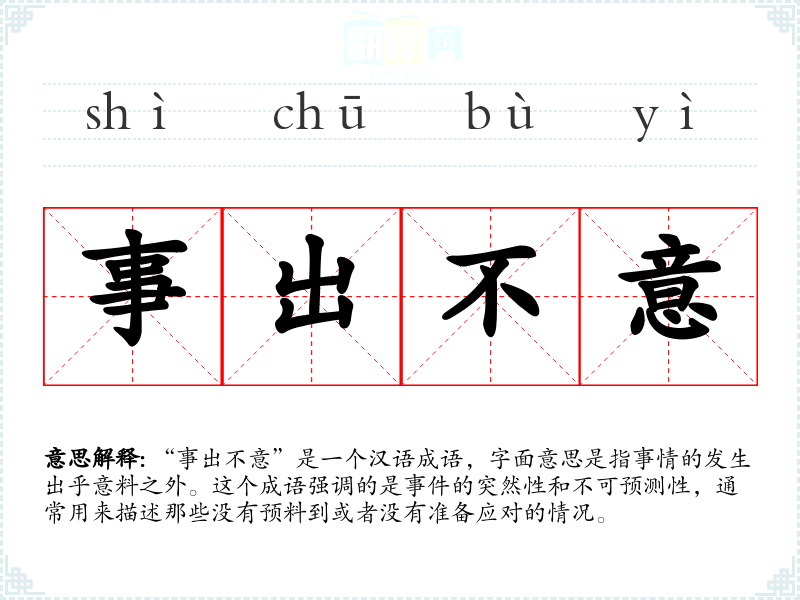 在文学作品中,“事出不意”常用来增加故事情节的紧张感和戏剧性,使读者感到意外和惊讶。在口语交流中,这个成语可以用来描述日常生活中的突发,如突然的天气变化、意外的访客等。在专业领域,特别是在风险管理和应急预案中,这个词汇提醒人们要时刻准备应对不可预见的。