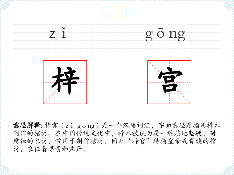 梓宫(zǐ gōng)是一个汉语词汇,字面意思是指用梓木制作的棺材。在传统文化中,梓木被认为是一种质地坚硬、耐腐蚀的木材,常用于制作棺材,因此“梓宫”特指或贵族的棺材,象征着尊贵和庄严。